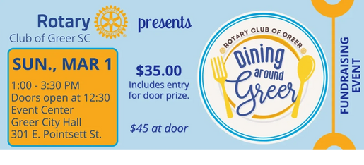 Dining Around Greer is our annual signature fundraiser where we raise money to support local non-profit work, and global Rotary initiatives.